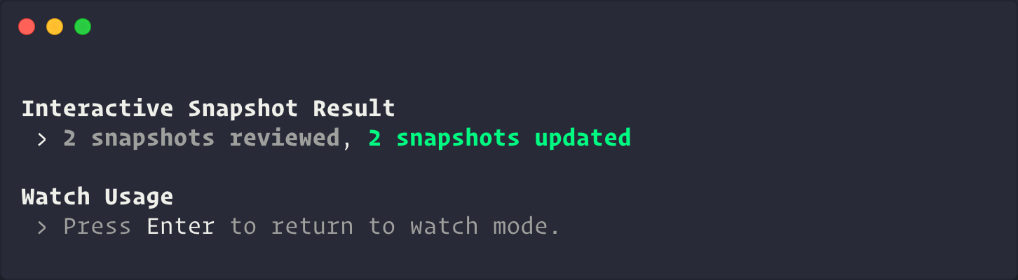Det er alt! Du kan også oppdatere snapshots med --updateSnapshot eller ved å bruke u-tasten i --watch-modus.